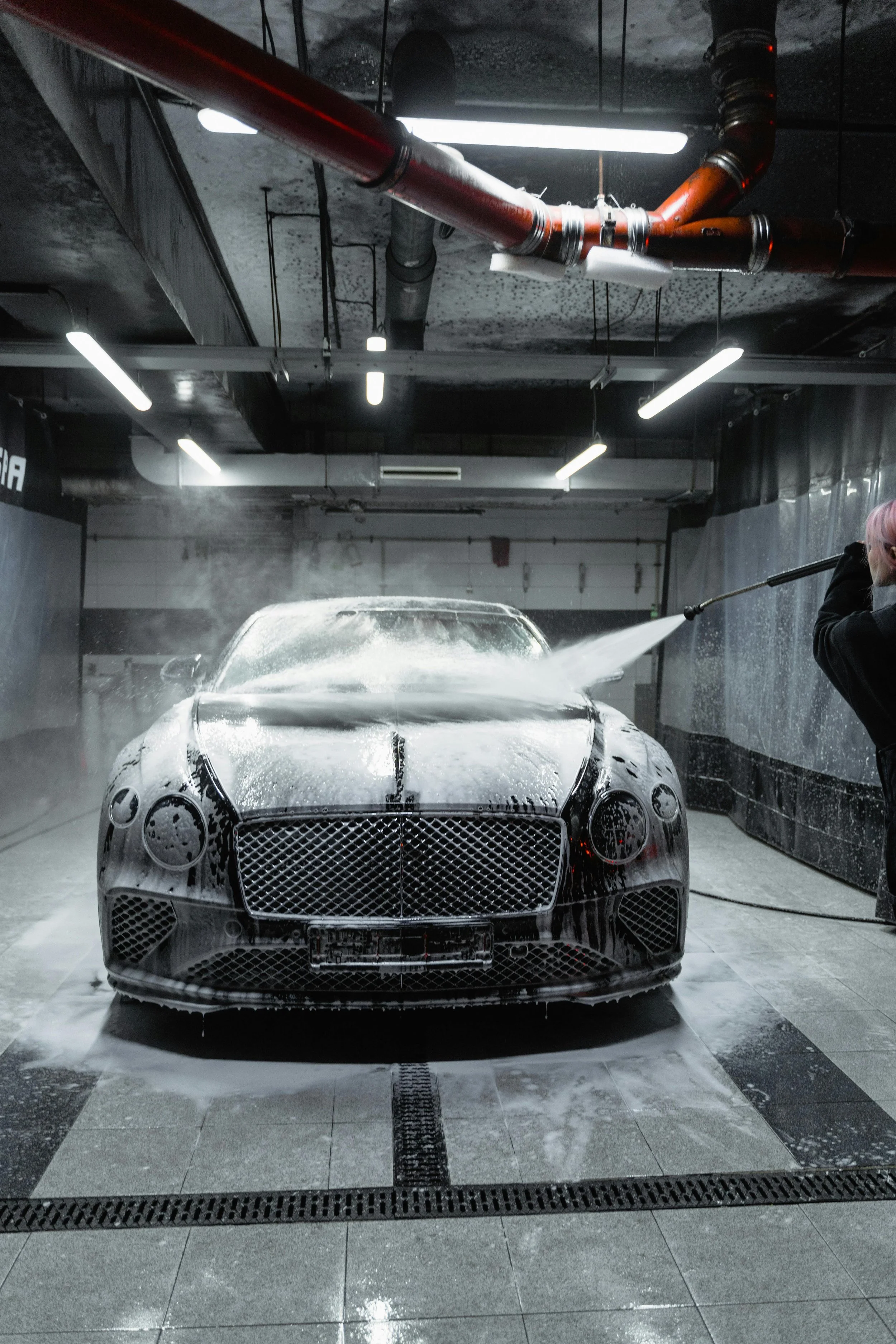 Person in black clothing sprays foam on a black car with a hose inside a modern, indoor car wash facility.