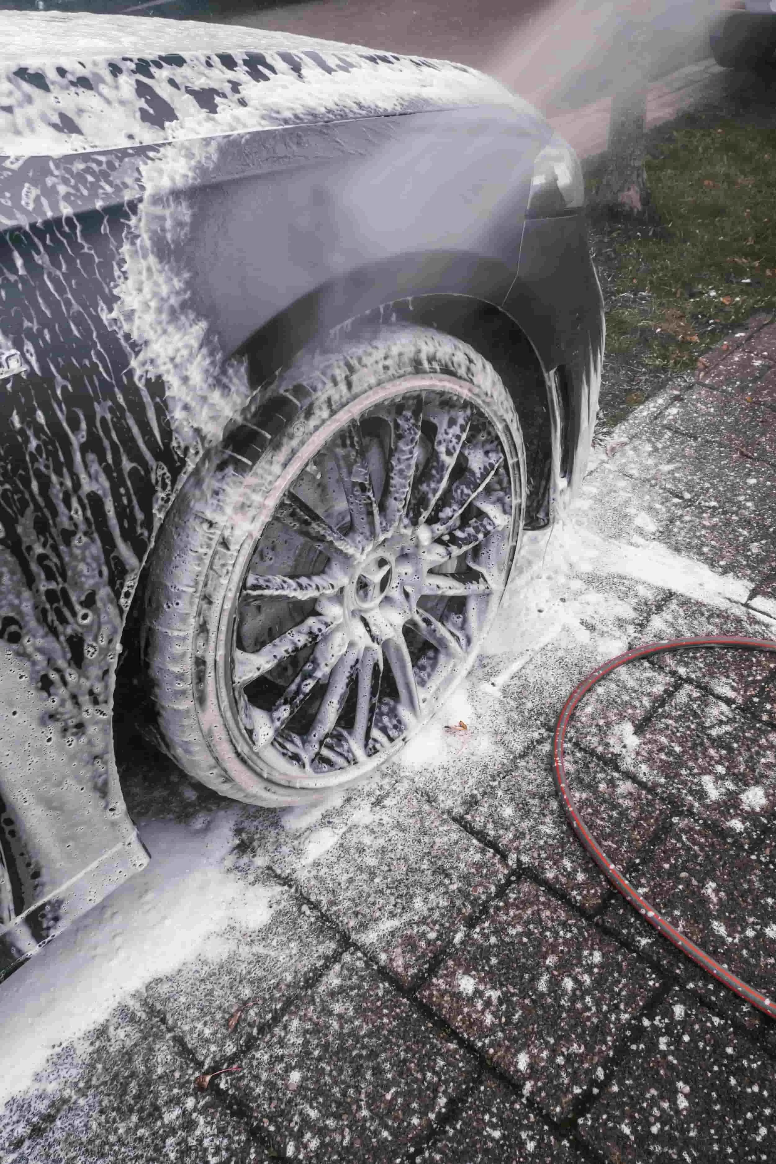 A black car being washed with foam, focusing on the front wheel and fender, on a soap-covered driveway.